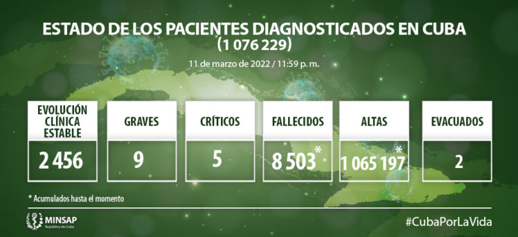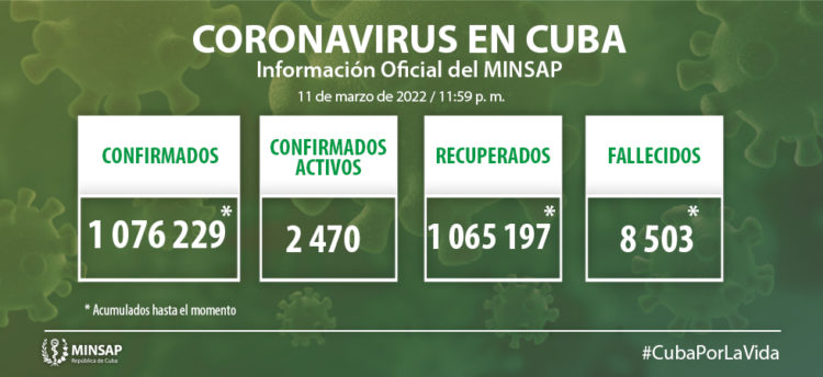 Cuba acumula un millón 76 mil 229 diagnosticados con el patógeno desde hace exactamente este día dos años de los primeros casos detectados y la cifra total de víctimas fatales como consecuencia de la pandemia se mantuvo en ocho mil 503.