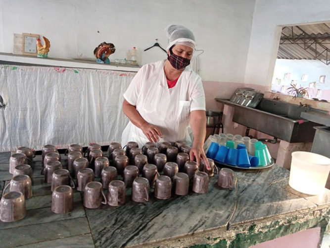 “En lo relacionado con el plato fuerte del almuerzo, hasta el momento hemos podido ofrecer croqueta, picadillo en salsa o fritura y en ocasiones huevo hervido. En la merienda damos sirope de naranja y hacemos té de las diferentes plantas sembradas en el huerto. Así vamos avanzando como se puede”, comentó Rubén Paz Matos, cocinero del lugar.