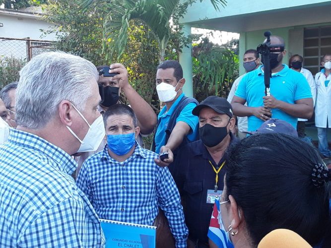 En su recorrido, el Presidente de la República de Cuba, intercambió con Marlén Rodríguez Callao, delegada de la circunscripción 36, para conocer del trabajo comunitario, y se le explicó la inserción laboral de quienes estaban desempleados, quedando pendiente una decena de mujeres, con la idea de sumarlas a los proyectos de un organopónico y una guarapera, previstos en el entorno.
