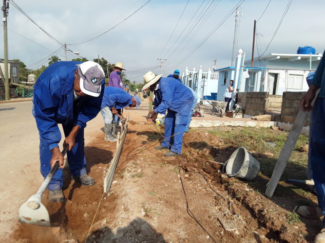También en pleno ajetreo laboral, la brigada provincial de mantenimiento de la división territorial de Etecsa en la provincia, asume parte de la fundición de las aceras que conducen de la escuela primaria Marina Azcuy, hasta El Chalet, pues el estar en las cercanías de la comunidad también nos compromete, dijo José Antonio García, uno de los ocho obreros con las manos en la obra.