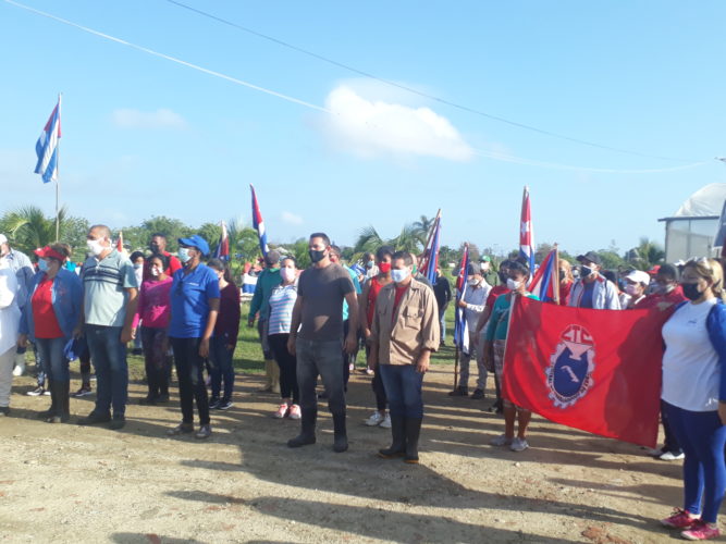 Desde el surco, anegado por la lluvia de la tarde anterior y por el sudor de los espirituanos, Oslidia López Martín, miembro del secretariado de la Central de Trabajadores de Cuba (CTC) en la provincia leyó la convocatoria que convida a las celebraciones por el Día del Proletariado Mundial.