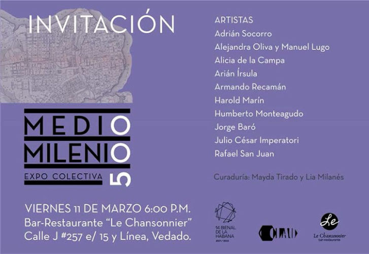 Dentro de la tercera experiencia de la 14 Bienal de La Habana, el pasado 11 de marzo se inauguró la colectiva Medio Milenio (Bar-restaurante Le Chansonnier), cuya curaduría estuvo a cargo de Mayra Tirado y Lía Milanés, dedicada a los 502 años de La Habana. “En esta oportunidad presenté la obra El Gran Muro, recreada en el malecón habanero. Se trata de dos fotos impresas sobre metacrilato, en mediano y gran formato, y que concebí como un collage de microfotografías de la superficie del muro. A este trabajo lo titulé Las sales serán diamantes.