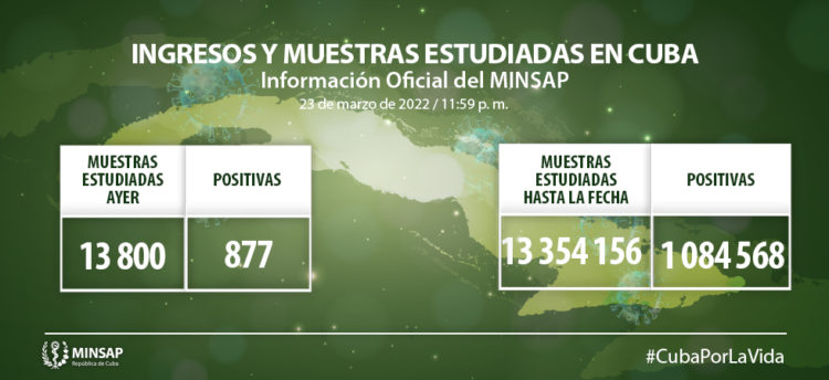 Para la COVID-19 se realizaron un total de 13 mil 800 muestras para la vigilancia en el día, resultando positivas 877. El país acumula 13 millones 354 mil 156 muestras realizadas y 1 millón 084 mil 568 positivas.