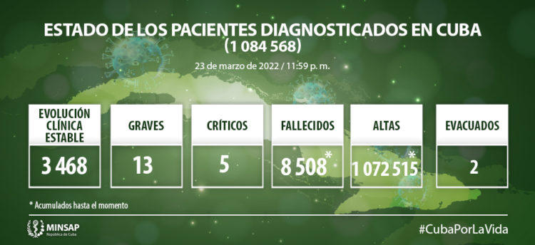 Del millón 084 mil 568 de pacientes diagnosticados con la enfermedad, se mantienen ingresados 3 mil 486, de ellos 3 mil 468 con evolución clínica estable. Se acumulan 8 mil 508 fallecidos (no se reportan fallecidos en el día), letalidad de 0,78% vs 1,29% en el mundo y 1,79% en Las Américas; dos evacuados, 57 retornados a sus países, en el día hubo 824 altas, se acumulan 1 millón 072 mil 515 pacientes recuperados (98.9%). Se atienden en las terapias intensivas 18 pacientes confirmados de ellos 5 críticos y 13 graves.