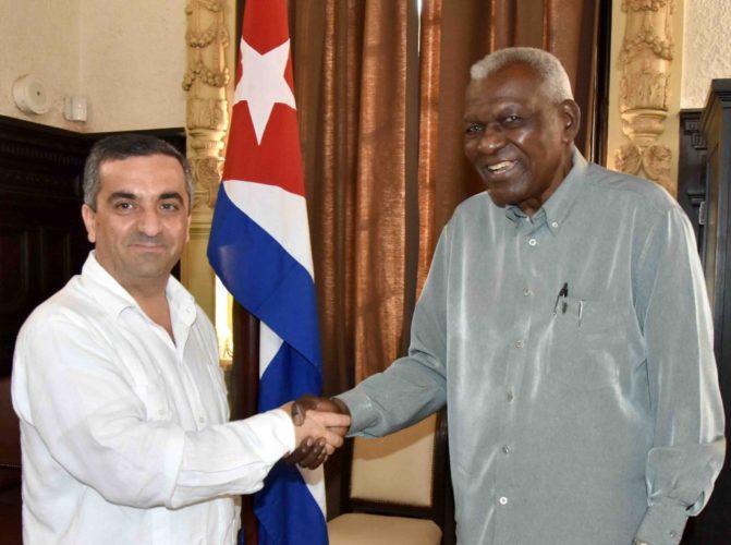 El pasado 30 de marzo, el Primer Secretario del Comité Central del Partido y Presidente de la República de Cuba, Miguel Díaz-Canel, recibió también al Embajador sirio. «Le agradecí su entrega en la promoción de los históricos lazos entre nuestros países. Reiteré la voluntad de impulsar las relaciones de amistad y cooperación», manifestó en Twitter el Jefe de Estado cubano a propósito del intercambio.