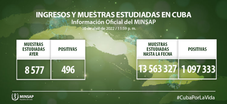 Para la COVID-19 se realizaron un total de ocho mil 577 muestras para la vigilancia en el día, resultando positivas 496. El país acumula 13 millones 563 mil 327 muestras realizadas y un millón 097 mil 333 positivas.