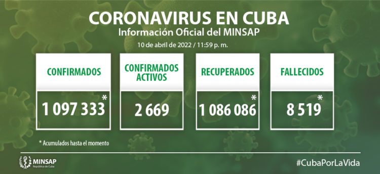 Según el parte diario, publicado en el sitio web del Minsap, del millón 97 mil 333 de pacientes diagnosticados con el virus en el país, permanecen ingresados dos mil 669, de ellos dos mil 638 con evolución clínica estable, nueve en estado crítico y 22 graves.