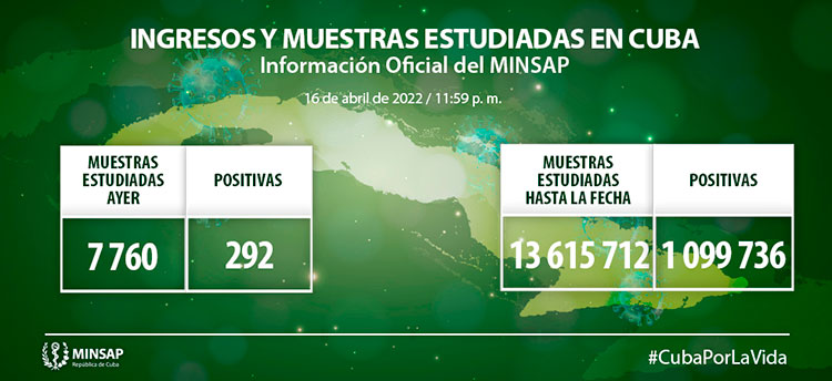 Para la COVID-19 se realizaron un total de 7 mil 660 muestras para la vigilancia en el día, resultando positivas 292. El país acumula 13 millones 615 mil 712 muestras realizadas y 1 millón 099 mil 736 positivas.