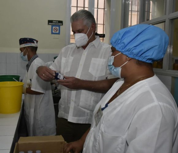El mandatario cubano, durante su visita a la Universidad de Ciencias Pedagógicas, visitó el Laboratorio Farmacéutico de Educación, proyecto desde el cual se producen mensualmente unos 12 mil frascos de medicamentos a partir de productos naturales.