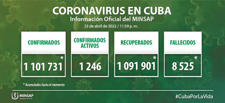 Del 1 millón101 mil 731 de pacientes diagnosticados con la enfermedad, se mantienen ingresados 1246, de ellos1228 con evolución clínica estable. Se acumulan 8 mil 525 fallecidos (2 en el día), letalidad de 0.77% vs 1,23%en el mundo y 1,78% en Las Américas; dos evacuados, 57 retornados a sus países, en el día hubo 298 altas, se acumulan 1 millón 091 mil 901 (99,1%).Se atienden en las terapias intensivas 18 pacientes confirmados de ellos 7 críticos y 11 graves.