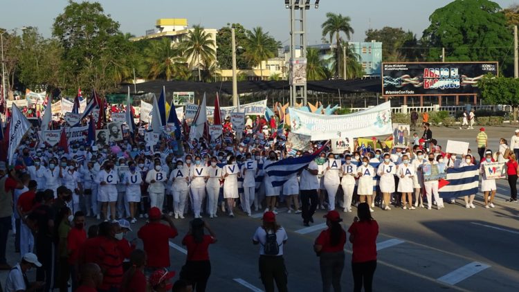 Cargados de méritos indiscutibles, los trabajadores de la Salud que enfrentaron –y enfrentan todavía- los efectos del Sars-CoV-2, en medio de innumerables carencias, encabezaron la movilización y acto seguido representantes de todos los sindicatos siguieron sus pasos para demostrar el compromiso de la clase obrera de continuar defendiendo las conquistas del socialismo en Cuba desde las trincheras del trabajo creador.