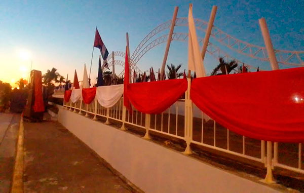La tribuna principal en la Plaza de la Ciudad de Cienfuegos amaneció bellamente engalanada con banderas cubana y del 26 de Julio y banderolas tricolores. Foto: Cortesía de la CTC