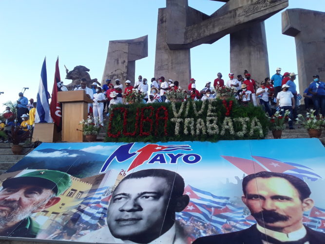 En el escenario principal de las celebraciones por el Día Internacional de los Trabajadores, la plaza Antonio Maceo Grajales, acogió a un pueblo jubiloso que estuvo acompañado por Salvador Valdés Mesa, vicepresidente de la República, las máximas autoridades del Partido y el Gobierno en la provincia, José Ramón Monteagudo y Beatriz Johnson, respectivamente, Isdalis Rodríguez, miembro del secretariado de la Central de Trabajadores de Cuba, René Berenger, secretario general de la organización proletaria en Santiago de Cuba, entre otros dirigentes.