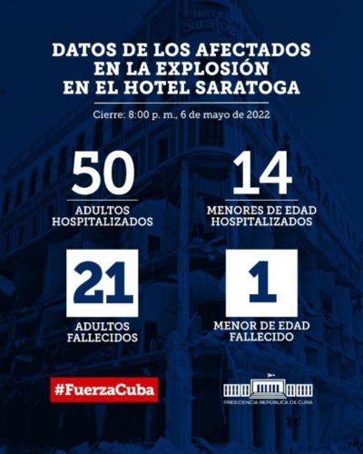 Informó la lamentable cifra de 18 muertos (suman 22 hasta pasadas las ocho de la noche al encontrarse cuatro fallecidos más entre los escombros), de ellos un niño, que a la pregunta de Trabajadores, no se precisaron detalles, pues aún se esclarecen las identidades de los cadáveres, en un proceso de identificación por expertos del Minint y Instituto de Medicina Legal.