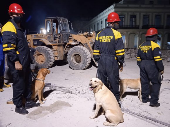 Instantes antes, los rescatistas aún no habían podido llegar al sótano, dónde se suponía que permanecieran personas con vida. Según la página oficial de la Corporación Cimex S.A, se emplea la técnica canina para encontrar a los sobrevivientes.