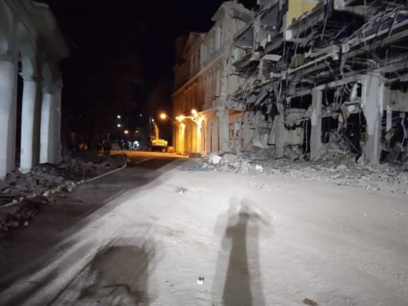 En horas de esta madrugada del 7 de mayo se ha intensificado la recogida de escombros en áreas cercanas al hotel, como la calle Dragones. Compartimos imágenes de Dairon Rhc, periodista presente en el lugar.