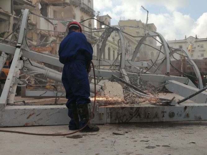 «Estamos ya terminando de limpiar la calle en el Hotel Saratoga, es un proceso un poco lento ya que los combatientes del Ministerio del Interior nos van liberando áreas. Nos queda el lateral izquierdo del hotel que es el edificio de viviendas que tuvo derrumbe, ahí ya comenzamos a trabajar con dos equipos retroexcavadoras», dijo René Mesa Villafaña, ministro de la Construcción.