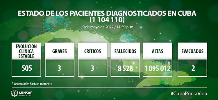 Del 1 millón 104 mil 110 de pacientes diagnosticados con la enfermedad, se mantienen ingresados 511, de ellos 505 con evolución clínica estable. Se acumulan 8 mil 528 fallecidos (1 en el día), letalidad de 0,77% vs 1,21% en el mundo y 1,77% en las Américas; dos evacuados, 57 retornados a sus países, en el día hubo 116 altas, se acumulan 1 millón 095 mil 012 (99,2%). Se atienden en las Terapias Intensivas 6 pacientes confirmados, de ellos 3 críticos y 3 graves.