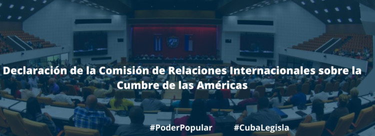 La Comisión de Relaciones Internacionales de la Asamblea Nacional del Poder Popular expresa su total respaldo a los pronunciamientos y la denuncia formulada el pasado 25 de abril por el compañero Bruno Rodríguez Parrilla, Ministro de Relaciones Exteriores, ante este nuevo acto agresivo de Estados Unidos contra Cuba, incluyendo las fuertes presiones y amenazas que el gobierno estadounidense ejerce sobre numerosos gobiernos latinoamericanos y del Caribe, intentando silenciar sus legítimos reclamos en favor de la presencia de Cuba en la llamada cita continental.