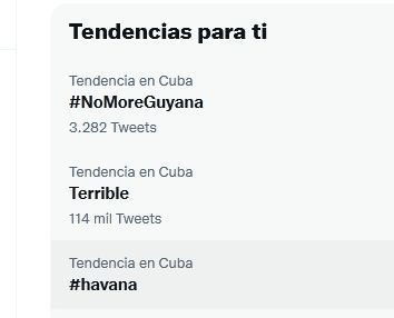 Desde hace ya un tiempo, la etiqueta #NoMoreGuyana aparece entre las principales tendencias para Cuba en Twitter, pero al siguiente día de publicarse que Estados Unidos anuncia medidas para Cuba y la Declaración del Minrex: Un paso limitado en la dirección correcta el hashtag se ha posicionado fuertemente entre las primeras con un vertiginoso incremento.