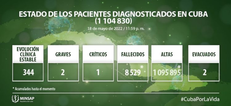 Del millón 104 mil 830 de pacientes diagnosticados con la enfermedad, se mantienen ingresados 347, de ellos 344 con evolución clínica estable. Se acumulan 8 mil 529 fallecidos (no se reportan fallecidos en el día), letalidad de 0,77% vs 1,2% en el mundo y 1,7% en las Américas; dos evacuados, 57 retornados a sus países, en el día hubo 110 altas, se acumulan 1 millón 095 mil 895 (99,2%). Se atienden en las salas de Cuidados Intensivos 3 pacientes confirmados, de ellos 1 crítico y 2 graves.