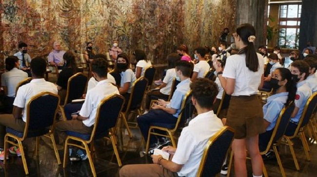 El presidente de Cuba, Miguel Díaz-Canel Bermúdez, conversa en en el Palacio de la Revolución con una representación de muchachos de la Federación Estudiantil de la Enseñanza Media (FEEM), como parte de los encuentros que sostiene habitualmente con los diferentes sectores de la sociedad cubana.