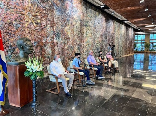 El presidente @DiazCanelB conversa #AHORA en el Palacio de la Revolución con una representación de muchachos de la @feemdecuba, como parte de los encuentros que sostiene habitualmente con los diferentes sectores de la sociedad cubana. #VamosConTodo pic.twitter.com/f8uFpvKdHx