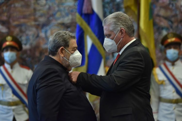 Miguel Díaz-Canel, primer secretario del Comité Central del Partido Comunista de Cuba y presidente de la República, impuso hoy la Orden José Martí a Ralph Everard Gonsalves, primer ministro de San Vicente y las Granadinas.