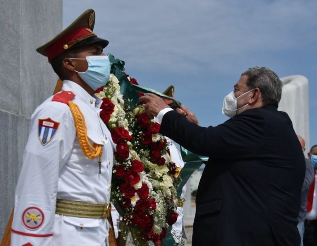 Gonsalves rindió tributo con una ofrenda floral al Héroe Nacional cubano durante esta jornada, en la cual se conmemora el trigésimo aniversario del establecimiento de relaciones diplomáticas entre ambos países.