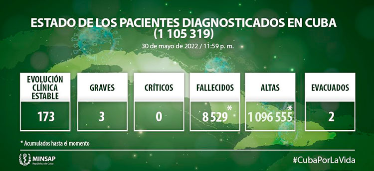 Del millón 105 mil 319 de pacientes diagnosticados con la enfermedad, se mantienen ingresados 176, de ellos 173 con evolución clínica estable. Se acumulan 8 mil 529 fallecidos (no se reportan fallecidos en el día), letalidad de 0,77% vs 1,19%en el mundo y 1,74% en las Américas; dos evacuados, 57 retornados a sus países, en el día hubo 45 altas, se acumulan 1 millón 096 mil 555. Se atiende en los Cuidados Intensivos 3 pacientes graves confirmados.