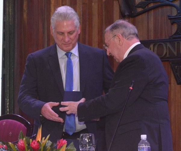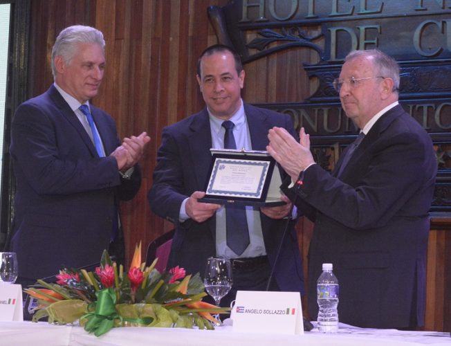 Como muestra de gratitud por el inolvidable apoyo que Cuba brindó a Italia en los duros días de la pandemia, el señor Ángelo Sollazzo hizo entrega al Presidente Díaz-canel Bermúdez, del “Sello al Hombre CIM del año”. Es una distinción, dijo el Presidente de la Confederación, que se otorga a pocos en el mundo. Ante todos, Sollazzo confesó que para él era un honor distinguir al mandatario.