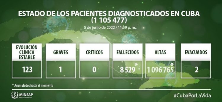 Del millón 105 mil 477 de pacientes diagnosticados con la enfermedad, se mantienen ingresados 124, de ellos 123 (99,2%) con evolución clínica estable. Se acumulan 8 mil 529 fallecidos (0 en el día), letalidad de 0,77% vs 1,18% en el mundo y 1,73% en las Américas; dos evacuados, 57 retornados a sus países, en el día hubo 29 altas, se acumulan 1 millón 096 mil 765 (99,2%). Se atiende en los Cuidados Intensivos 1 paciente grave confirmado.
