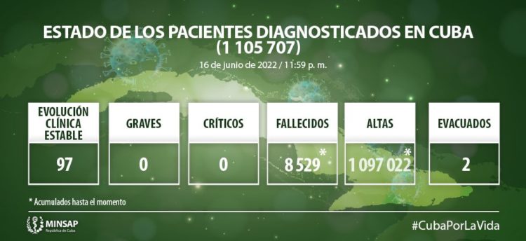 De millón 105 mil 707 pacientes diagnosticados con la enfermedad, se mantienen ingresados 97, de ellos 97 (100 %) con evolución clínica estable. Se acumulan 8 mil 529 fallecidos (0 en el día), letalidad de 0,77% vs 1,17% en el mundo y 1,72% en las Américas; dos evacuados, 57 retornados a sus países, en el día hubo 17 altas, se acumulan 1 millón 097 mil 022 (99,2%). No se reportan pacientes graves ni críticos confirmados ingresados en los Cuidados Intensivos del país.