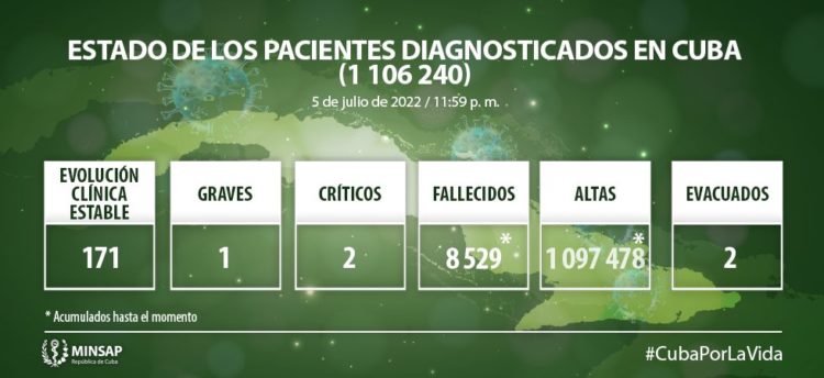 De 1 millón 106 mil 240 pacientes diagnosticados con la enfermedad, se mantienen ingresados 174, de ellos 171 con evolución clínica estable. Se acumulan ocho mil 529 fallecidos (no se reportan fallecidos en el día), letalidad de 0,77 % vs 1,15 % en el mundo y 1,69 % en las Américas; dos evacuados, 57 retornados a sus países, en el día hubo 41 altas, se acumula un millón 097 mil 478 (99,2 %). Se atienden en los Cuidados Intensivos tres pacientes confirmados, de ellos dos pacientes críticos y un paciente grave.