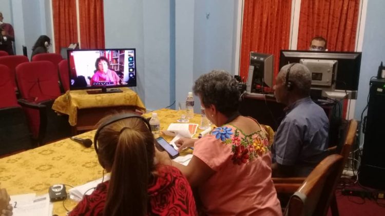 Desde el teatro del Palacio de Computación de Santiago de Cuba se estableció contacto virtual con representantes de grupos de solidaridad con Cuba en varias naciones, quienes además lideran organizaciones de diverso tipo que comparten el interés por defender los derechos de los pueblos caribeños.