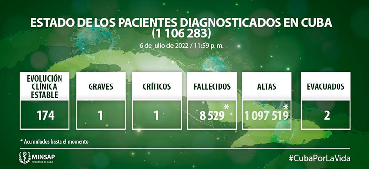 Del millón 106 mil 283 pacientes diagnosticados con la enfermedad, se mantienen ingresados 176, de ellos 174 con evolución clínica estable. Se acumulan 8 mil 529 fallecidos (0 en el día),letalidad de 0,77% vs 1,14% en el mundo y 1,68% en las Américas; dos evacuados y 57 retornados a sus países. En el día hubo 41 altas, se acumulan 1 millón 097 mil 519 (99,2%). Se atienden en los Cuidados Intensivos 2 pacientes confirmados, de ellos 1 paciente crítico y 1 paciente grave.