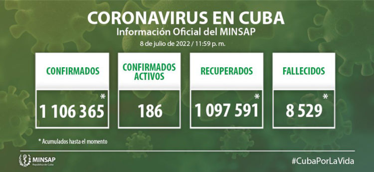 De 1 millón 106 mil 365 pacientes diagnosticados con la enfermedad, se mantienen ingresados 186 (0,02%), de ellos 184 (98,9%) con evolución clínica estable. Se acumulan 8 mil 529 fallecidos (0 en el día), letalidad de 0,77% vs 1,14% en el mundo y 1,68% en las Américas; dos evacuados, 57 retornados a sus países, en el día hubo 37 altas (1 menos que los diagnosticados), se acumulan 1 millón 097 mil 591 (99,2%). Se atienden en los Cuidados Intensivos 2 pacientes confirmados, de ellos 1 paciente crítico y 1 paciente grave.