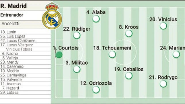 Todo son hipótesis. Lo que es casi seguro es que se podrá ver a los dos únicos fichajes con los que se ha reforzado el campeón de Europa, Rüdiger y Tchouameni. Y que en el carrusel de cambios, no es cuestión de forzar la máquina, van a tener su oportunidad un buen puñado de los 27 integrantes de la expedición blanca.