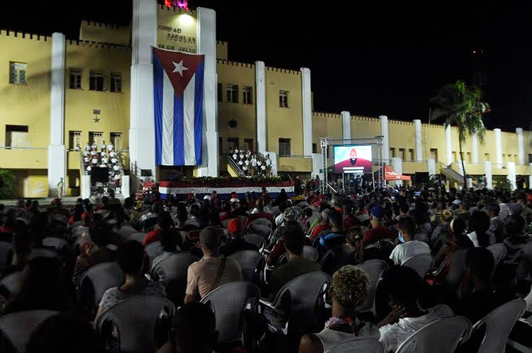 Previo al sentido momento, en la explanada central de la ciudad escolar 26 de Julio, se reeditó de manera simbólica la hazaña de los revolucionarios que llegaron hasta la posta 3 del Moncada para enfrentarse a tiros contra los soldados de la dictadura de Batista.