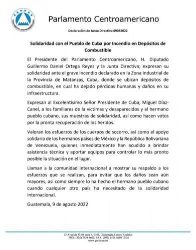 Por su parte, el Presidente del Parlamento Centroamericano (PARLACEN), Guillermo Daniel Ortega Reyes, y la Junta Directiva, expresaron también su apoyo a la nación caribeña ante el lamentable incidente. Además, «valoran los esfuerzos de los cuerpos de socorro, así como el apoyo solidario de los hermanos países de México y la República Bolivariana de Venezuela, quienes inmediatamente han acudido a brindar asistencia técnica y aportar equipos para controlar lo más pronto posible la situación en el lugar».