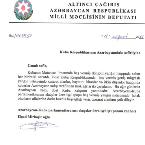El diputado Elshad Mirbashir Oglu, jefe del Grupo de Trabajo de Relaciones Interparlamentarias Azerbaiyán-Cuba, manifestó que en estos días difíciles, el pueblo de la nación asiática «apoya al pueblo amigo de Cuba», sus profundas condolencias a las familias de los fallecidos a consecuencia del incendio y deseos de pronta recuperación de los heridos.