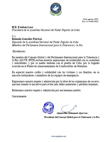 En misiva del Consejo Global y del Parlamento Internacional para la Tolerancia y la Paz, fue trasladada la solidaridad con la Asamblea Nacional del Poder Popular y con el pueblo de Cuba por la tragedia ocurrida.