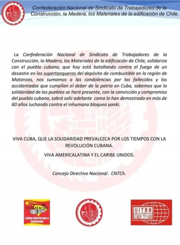 Desde la Federación Provincial de Trabajadores de Manabí (Ecuador), “tierra ardiente y levantisca, nuestra solidaridad con los hermanos de Matanzas y de Cuba”; el Sindicato de Trabajadores del Instituto Salvadoreño del Seguro Social; el Sindicato Unión Nacional de Empleados de la Caja y la Seguridad Social (UNDECA), de Costa Rica; y la Coordinación FSM Mesoamérica y el Caribe, llegaron cartas en las que expresan el profundo dolor que ha ocasionado la tragedia que ha vivido Cuba y llaman a las organizaciones de la región y del mundo a “sumarse con solidaridad efectiva”, lo cual se traduce en colectar y enviar insumos y recursos a los damnificados y al pueblo matancero.
