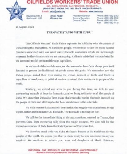 Los sindicalistas de OWTU recordaron que el pueblo cubano arriesgó su vida durante el momento crítico del Ébola y la Covid-19 para atender a muchas personas de distintas partes del mundo sin preguntarles credo, raza o postura política. Además, criticaron el bloqueo imperialista y las sanciones contra Cuba que,en estas circunstancias, no hicieron sino alimentar las llamas desatadas en Matanzas.
