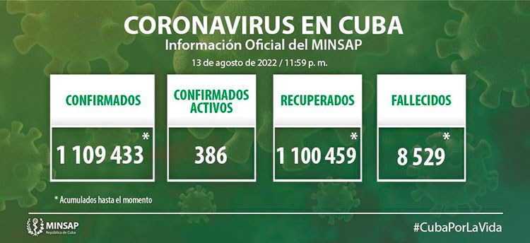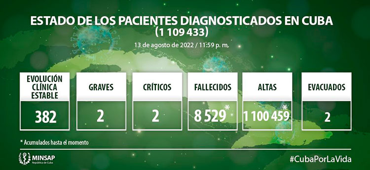 De 1 millón 109 mil 433 pacientes diagnosticados con la enfermedad, se mantienen ingresados 386, de ellos 382 con evolución clínica estable. Se acumulan 8 mil 529 fallecidos (no se reportan fallecidos en el día), letalidad de 0,77 % vs 1,09 % en el mundo y 1,62% en las Américas; dos evacuados, 57 retornados a sus países, en el día hubo 82 altas, se acumulan 1 millón 100 mil 459 (99,2%). Se atienden en los Cuidados Intensivos 4 pacientes confirmados, de ellos 2 pacientes críticos y 2 pacientes graves.