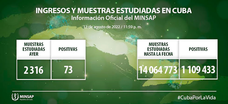 Para la COVID-19 se realizaron un total de 2 mil 316 muestras para la vigilancia, resultando positivas 73. El país acumula 14 millones 064 mil 773 muestras realizadas y 1 millón 109 mil 433 positivas.