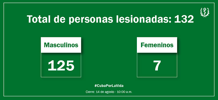 Hasta las 10:00 a. m. del 14 de agosto resultaron lesionadas 132 personas, de ellas 20 se encuentran hospitalizadas, dos personas fallecieron y 110 pacientes recibieron el alta médica.