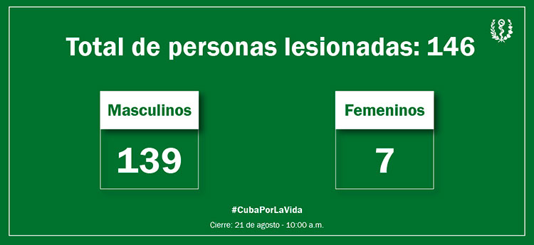 Hasta las 10:00 a. m. del 21 de agosto resultaron lesionadas 146 personas, de ellas 17 se encuentran hospitalizadas, 16 personas fallecieron y 113 pacientes recibieron el alta médica.