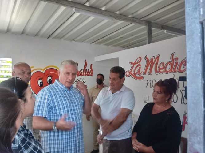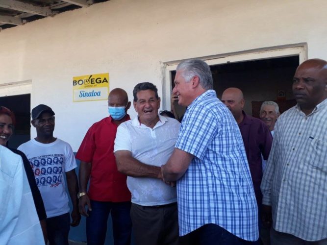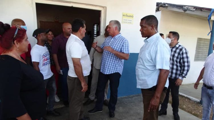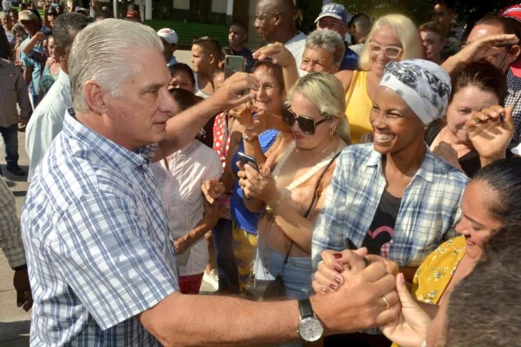 El mandatario cubano departió con los pobladores, mientras recorrió el Círculo Social, la bodega, el puesto médico donde dialogó con la enfermera, y saludó a los trabajadores de un merendero no estatal.