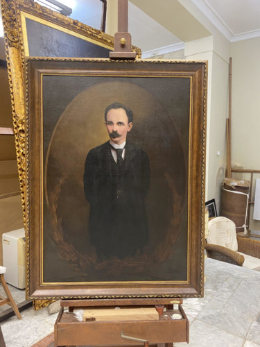 La pieza había sido restaurada en el 2013 en el propio taller, cuando la alistaron para ser exhibida en el Teatro Martí a partir de su reapertura el 24 de febrero del 2104: «En aquella ocasión colocamos algunos parches al lienzo, retocamos la pintura y lo barnizamos».
